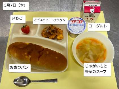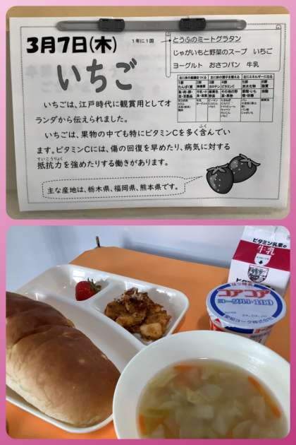 本日の給食に『いちご』が配食されます。熱々『とうふのミートのグラタン』『じゃがいもと野菜のスープ』をいただき、デザートにいただいてください。