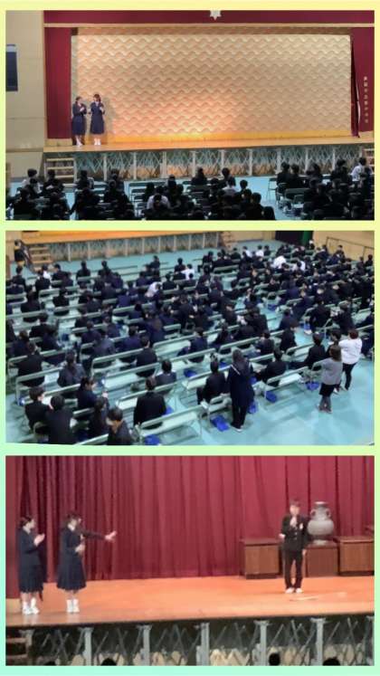 体育館では、1時間目に1年生が卒業式の練習用に会場の準備をしてくれました。続いて、式に向けての練習の時間。午後は、3年生が、代表生徒の司会進行による、有志の出演によるお別れ会です。名残はつきませんが、楽しい時間を共有しています。