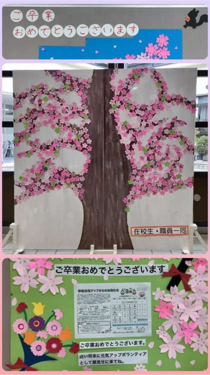 卒業式に向けて、恒例になった桜が玄関ホールに登場。生徒会による在校生と教職員のメッセージの桜。『卒業おめでとうございます!』。また、元気アップの掲示が卒業式への機運を高めます。