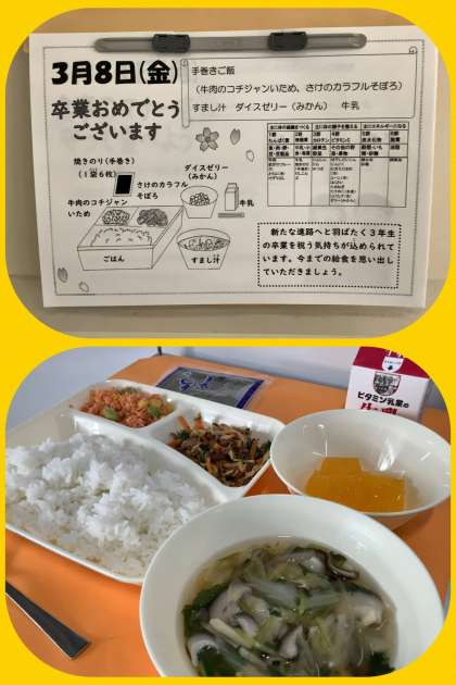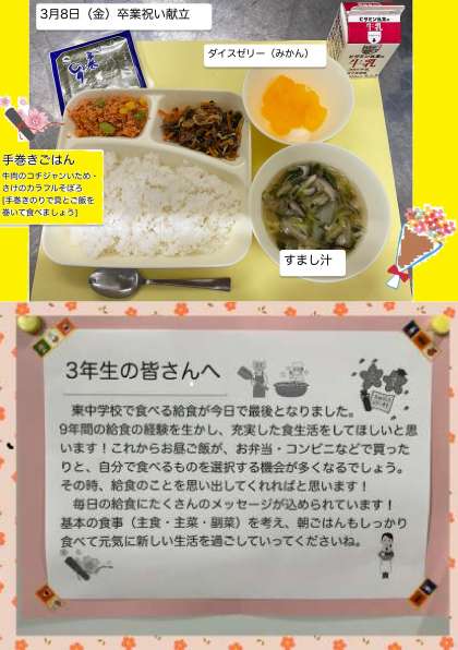 中学校で3年間、小学校から合わせると9年間、いろいろな方にお世話になっていただいてきた給食。とりわけ今年は、新校舎の1階で調理された、出来立て・熱々の給食をいただくことができました。ありがとうございました。