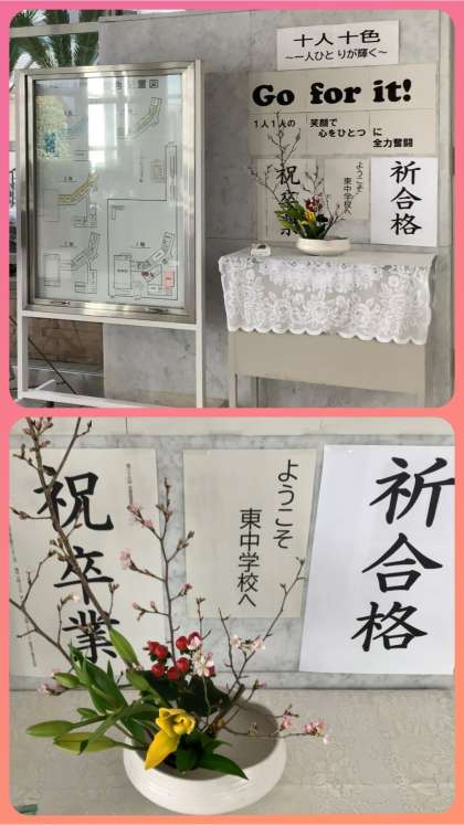 さて、明日、第36回卒業証書授与式を挙行いたします。式に合わせて、昨日、玄関のお花を生け替えていただきました。いつも東中生のためにありがとうございます。お題は『旅立ちを祝して』、お花は「啓翁桜・ユリ・ペリカム」。儀式行事に相応しい厳かなお花です。今日は雨模様ですが、明日はきっと晴れるでしょう!グランド沿いの桜の花芽が色付いてきました。明日の卒業式が36期生の心に残る儀式的行事になりますようにーーー。