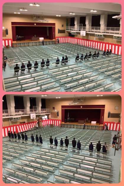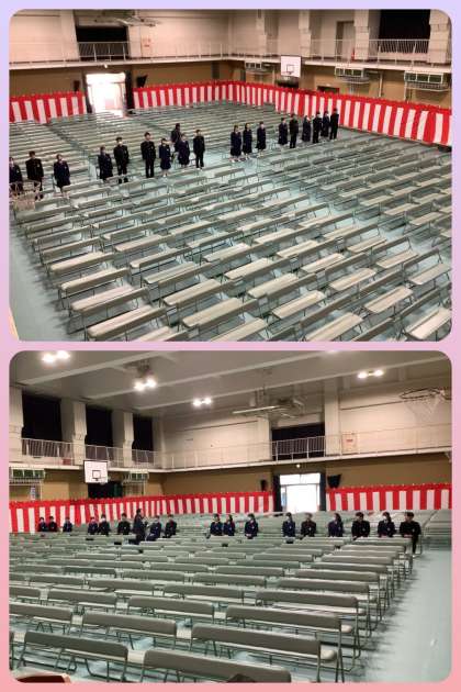 2年生が全員参加する卒業式予行を明日に控え、体育館に椅子と紅白幕が本番用にセットされ、卒業式への気運を盛り上げます。今日の6時間目には、在校生代表生徒による所作の確認練習をしました。さすが、各クラスの代表生徒の皆さんです。緊張感の中にも、堂々とした所作で、動きを確認していきました。横一列で、歌うのはなかなか難しいでしょうが、明日の予行と本番の式では、3年生と一緒に合唱できます。貴重な経験であり、かけがえのない時間となります。しっかりと歌いましょう。