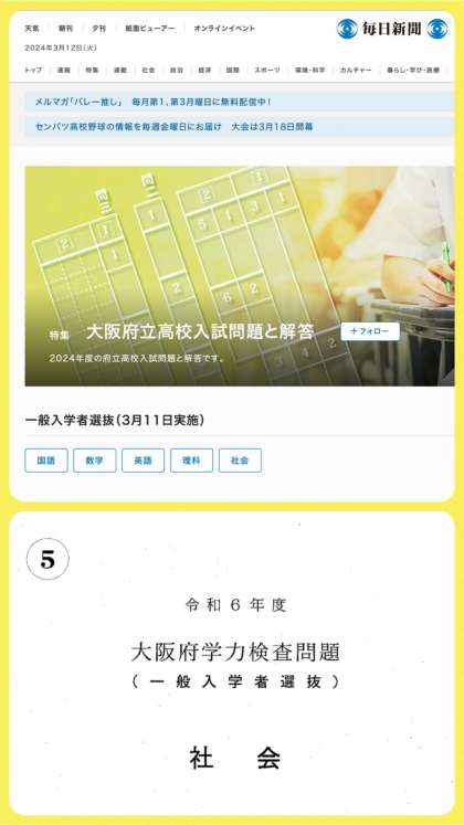 問題と解答については、毎日新聞WEBページより閲覧できますので、リンクを掲載します。