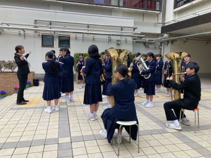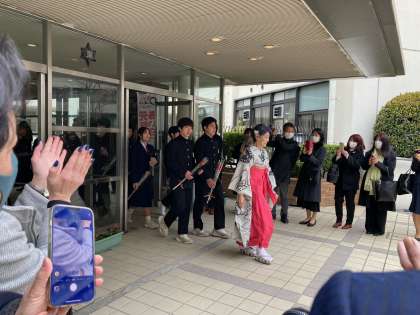 巣立ちの時です。吹奏楽部の演奏に合わせ、400人近い保護者の方の拍手に送られ、正門を後にします。