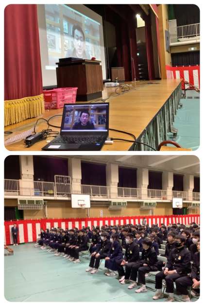 3月12日(火)、卒業式予行終了後、同窓会入会式とPTA記念品贈呈式を行いました。東中1期生である同窓会長は、日本全国を駆け巡って仕事をされてられ、メッセージをビデオレターで頂戴しました。ウクライナからエンジニア研修でお越しになった方との交流やエピソードを交え、卒業生に心温まるエールをいただきました。ありがとうございました。また、入会記念品として、図書カードをいただきました。