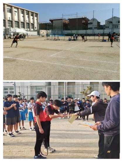 2年生は普段の練習の成果を発揮するプレーが光り、優勝候補のペアを破る大金星の試合もあるなど、見事に3ペアがベスト4に進出!!そして、決勝戦は、手に汗握る大接戦となりましたが、大正東中学校ペアに競り勝ち、見事に優勝を勝ち取ることができました!!