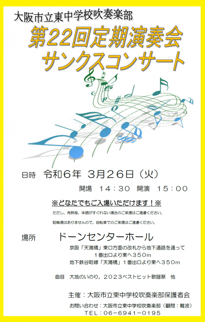さて、3月26日(火)午後に行う定期演奏会サンクスコンサートのお知らせを再掲します。平日の午後の開催ですが、お時間がありましたら、会場のドーンセンターで、東中サウンドをお楽しみください。