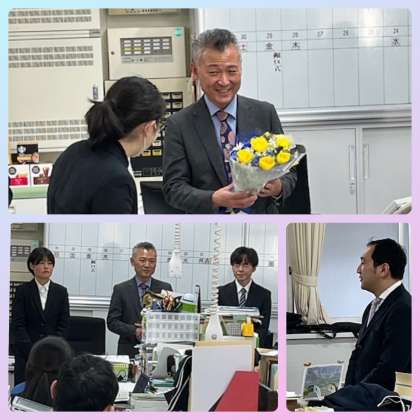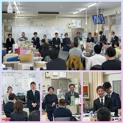 今年度末の人事異動により東中学校を離任される皆さまとのお別れのセレモニーを行いました。所用で欠席される方もあり、8名の方とのセレモニーとなりました。お一人おひとりのご紹介とスピーチの後、教職員代表の惜別の言葉があり、お花をお渡ししました。東中での勤務の期間はそれぞれですが、東中学校の教育活動の充実・発展にご尽力いただきましたことに感謝です。ありがとうございました。