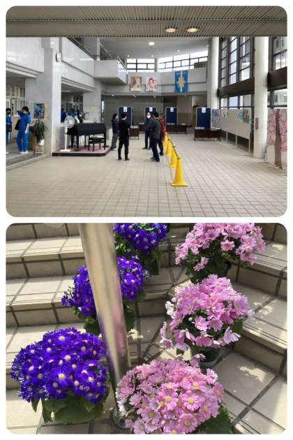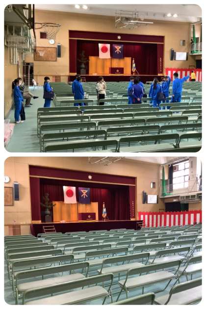 会場の体育館とリモート会場(新校舎6階)が、新2年生の活躍で整ってきました。どうか、以下の点にご留意いただき、お越しください。なお、雨の予報になっています。雨をできるだけ回避していただけるよう、係のものが誘導いたしますので、ご理解とご協力をお願いします。