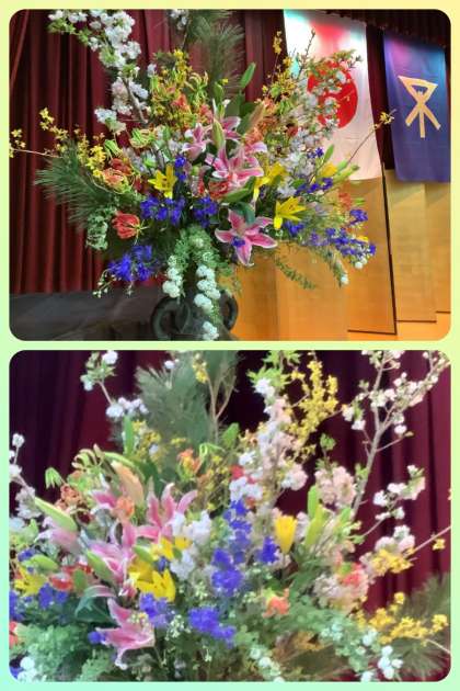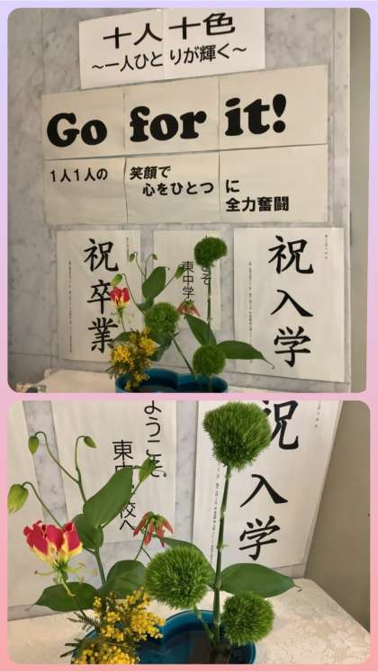 さて、入学式に合わせて、玄関ホールのお花を生け替えていただきました。お題は「新しい夢」、お花は「グロリオサ・てまり草・ミモザ」です。いつも東中生のためにありがとうございます。今年度もよろしくお願いします。