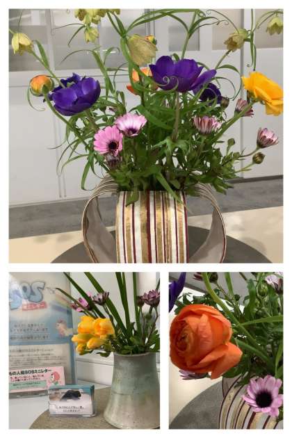 始業式の朝を迎えました。グランドの桜も綺麗に咲いています。玄関ホールと職員室前のお花は地域の方によって、生け替えていただきました。ありがとうございます。玄関ホールには「アシガサユリ・アネモネ・ピンクのお花(ベランダでお育てになったお花)」、職員室前は「フリージア」です。今年度もよろしくお願いします。