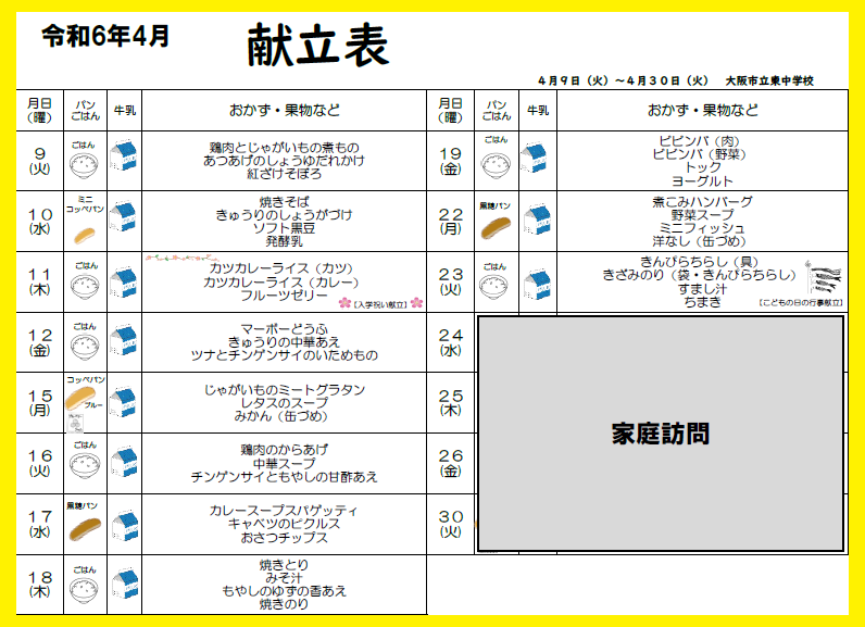 明日から給食の提供が始まります。生徒の皆さんは、ランチョンマットの用意をお願いします。また、本日、連絡のあった給食当番の皆さんは、「マスク・エプロン・三角巾(バンダナでの代用も可能です)」の3点セットの用意もお願いします。