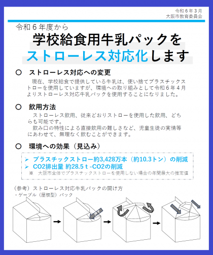 「ストローレス対応牛乳パックでの牛乳供給の促進」についての要望を踏まえて、今般、供給事業者との調整を経てストローレス対応牛乳パックへの移行ができることとなり、令和6年度からストローレス対応牛乳パックでの牛乳供給を原則とする旨の通知が大阪府からあり、大阪市においても令和6年度よりストローレス対応牛乳パックの供給が開始されることとなりました。