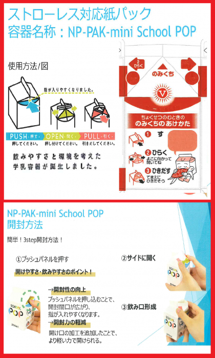 本校に納入されている牛乳パックは屋根型で、大阪府からは、ストローレスで飲むことができ、また、引き続き、ストロー口もあるためストローを使用して飲用できる牛乳パックであるとの説明を受けています。