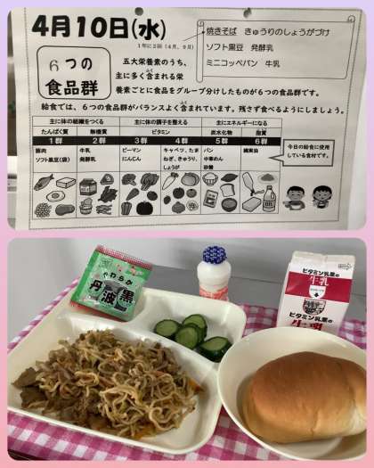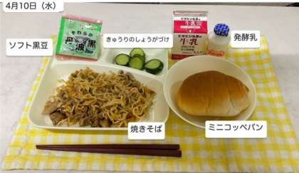 本日の給食は、1年に2回提供される焼きそばときゅうりのしょうがづけ、ソフト黒豆、発酵乳、ミニコッペパン、牛乳です。