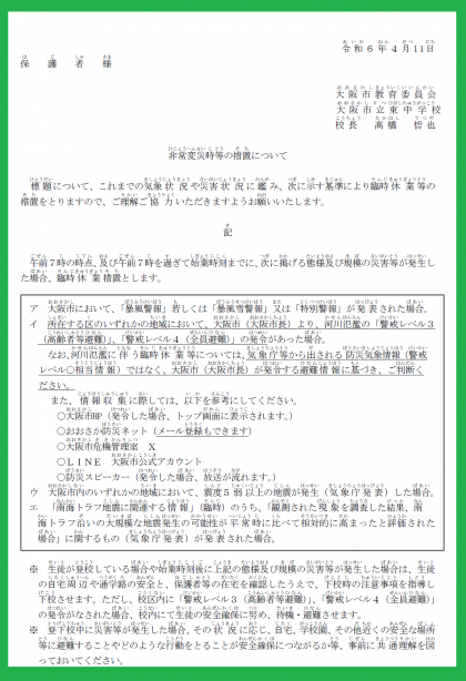 大阪市教育委員会から非常変災時の措置についてのお知らせが届きましたので掲載します。