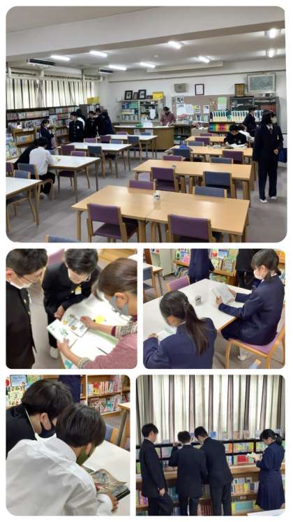 昼休みの図書室は、元気アップのコーディネーターとボランティアの皆さんのお力添えで、すでに昨日から開館しています。1年生もたくさん来室し、気になる本が見つかった生徒もあるようです。