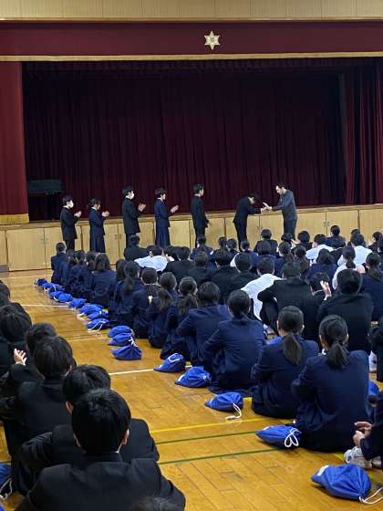 まず初めに、2年生の3学期に行った「ビブリオバトル」の表彰。受賞した皆さんおめでとうございます。