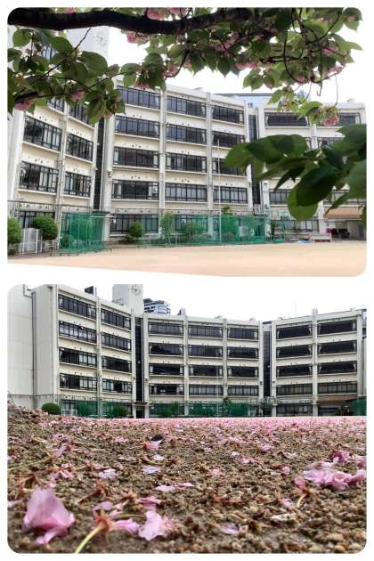雨上がりの曇り空の朝を迎えました。新しい1週間が始まります。八重桜の花びらが風に舞い、グランドに彩を添えます。