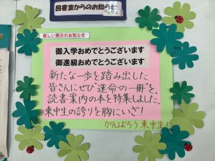 東中学校では、元気アップのコーディネーターやボランティアと生徒の図書委員に加えて、司書の先生方が連携して、ほぼ毎日、昼休みと放課後に開館しています。ありがとうございます。生徒の皆さんは、この環境への感謝の気持ちをもって、図書館を利活用していきましょう。