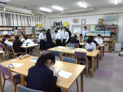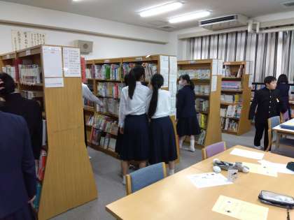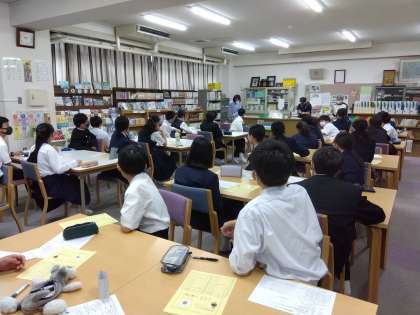 1年生は、国語の授業で図書室の使い方についての学習・ガイダンスを受けました。この授業には、国語の先生に加え、元気アップのコーディネータとボランティアの方々、そして、司書の先生にもサポートしてもらいました。皆さま、ありがとうございました。