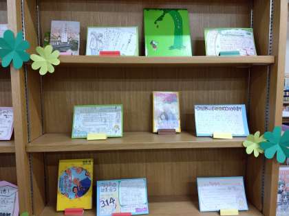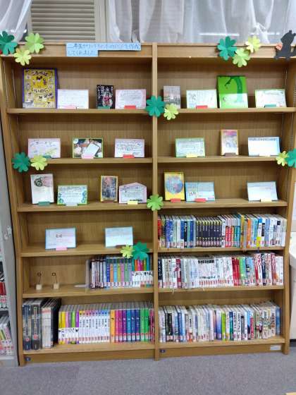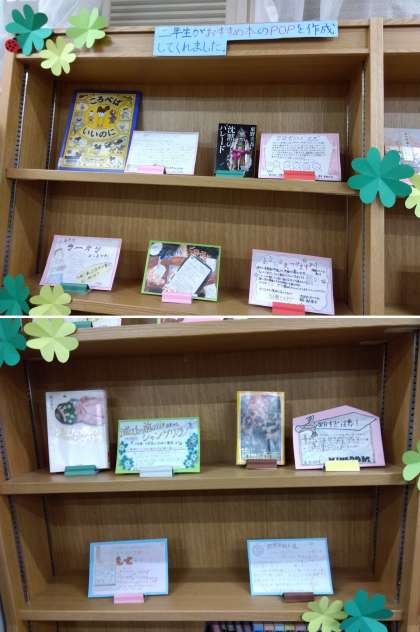 2年生のおすすめの本が図書室に展示されています。昨年の国語の課題で取り組んだ「おすすめの本のPOP」を使って、学校司書の先生や元気アップのコーディネーターやボランティアの皆さんがきれいに飾り付けをしてくださっています。是非、おすすめの本を手に取って、読んでみてください。
