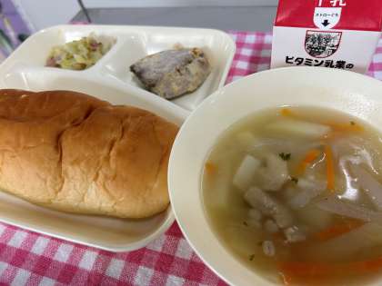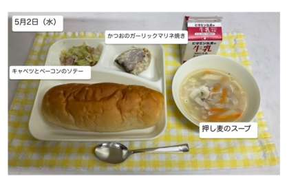 本日の給食では『かつおのガーリックマリネ焼き』が提供されます。『押麦のスープ』と『キャベツとベーコンのソテー』『おさつパン』と一緒に、給食をしっかりいただいて丈夫な身体をつくりましょう!そして、残食ゼロをめざしましょう。