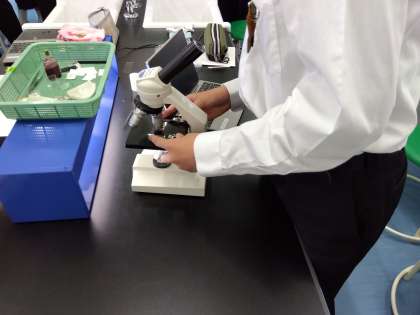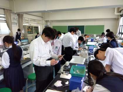 2年生の理科の授業で、細胞の『核』を染色し、顕微鏡で観察しました。動物細胞はヒトの「ほお」、植物細胞は「タマネギの葉の表皮」の細胞を用いました。スケッチを描いた後、タブレット端末を使い記録を残しました。みんな集中して取り組んでいました。