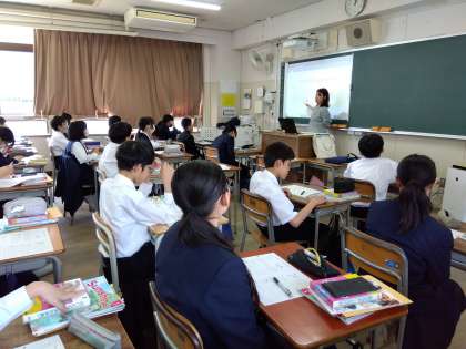 1年英語:自己紹介の作文の学習をしました。また、「なりきり自己紹介」として、スピーキングの課題にも取り組みました。