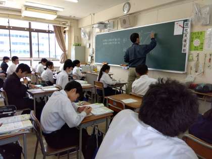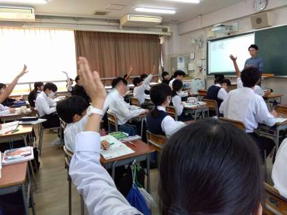 2年社会:戦国時代の単元で城下町の成り立ちについて考えました。先生の問いかけに対し、積極的に意見が出ていました。
