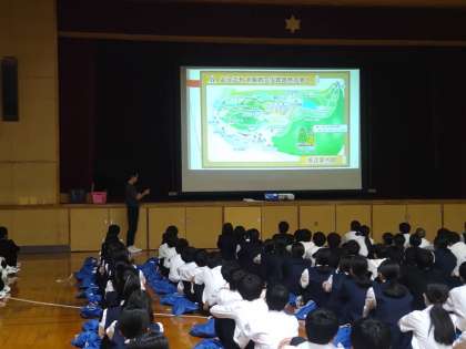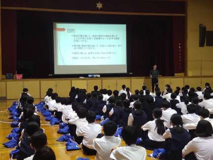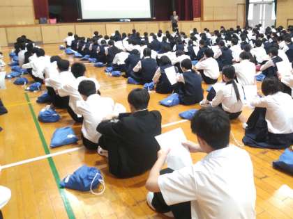 1年生は、1時間目に体育館で、6月6日(木)7日(金)に行う『一泊移住』についての説明がありました。