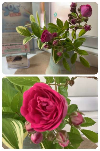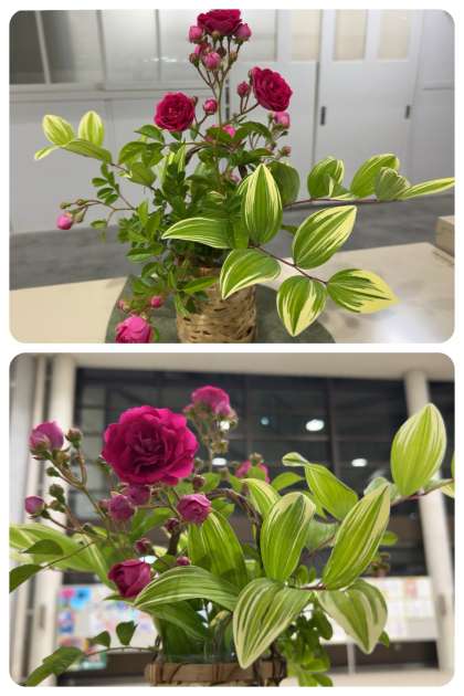 新学期の1ヶ月が終わり、2ヶ月目に入ります。玄関ホールと職員室前のお花を『バラと甘野老(あまどころ)』に生け替えていただきました。「ベランダで咲いてくれた草木です」との添え書きがありました。いつも東中生のためにありがとうございます。