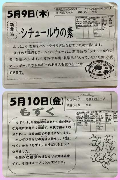 本日の給食で、『鶏肉とコーンのシチュー』が提供されます。これまでのルウは、小麦粉をバターやサラダ油などで炒めて作っていました。今日のシチューでは、小麦アレルギー、乳アレルギーのある人も食べることができるように、新商品の『シチュールウの素』を使っています。アレルギーのある人も安心していただいてください。