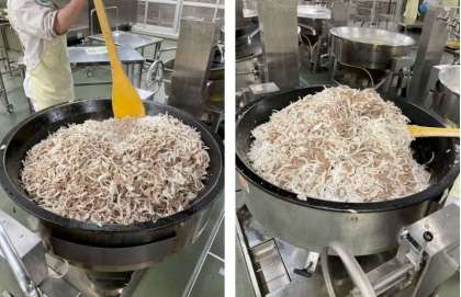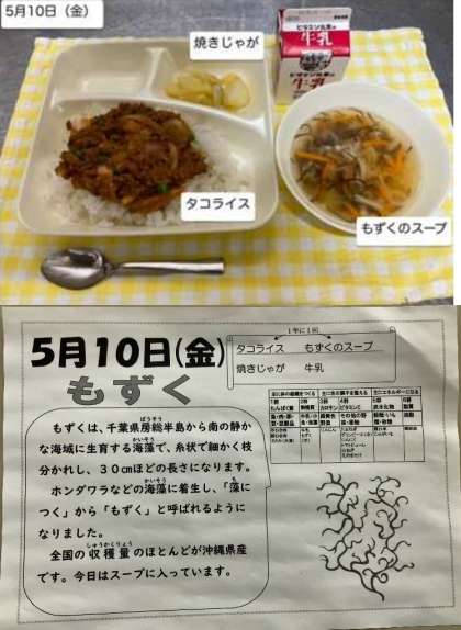 タコライスを作っている写真です。野菜は炒めていくと分量がどんどん少なくなっていきますね。もずくのスープ・焼きじゃがと一緒にいただきます。