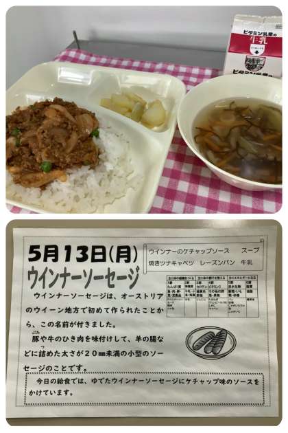 来週月曜日には、ウインナーソーセージのケチャップソースが提供されます。スープに焼きツナキャベツ、レーズンパンと一緒にいただきましょう!!