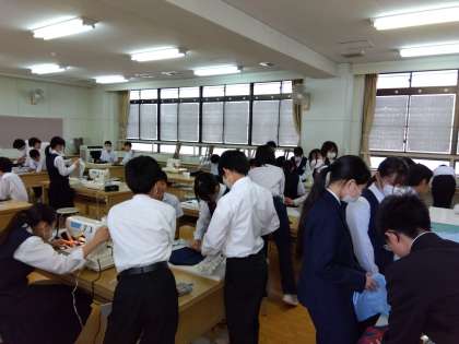 2年家庭:弁当を入れる袋を作っています。だいぶん出来上がってきているようです。上手に作ることができています。