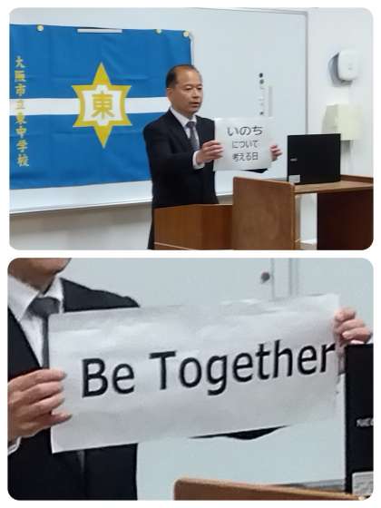 まず初めに、この取組が行われるようになった経過の説明がありました。「この取組は、東中の先輩が小学生の時に『子ども市会』で提案したことをきっかけとして、大阪市立のすべての小中学校で行われるようになり、今年で8回目となりました。毎年、約12万人の小学生と約5万人の中学生が、この日に「いじめ」について考え、昨年度からは「いのち」についても考える日となりました。」