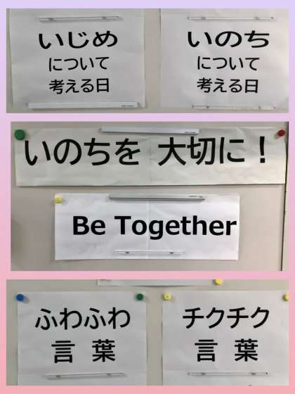 今日は「いじめ・いのちについて考える日」です。朝のリモートでの全校集会では、常置委員会からの報告に続いて、校長先生から「いじめといのちについて考える日」の講話がありました。