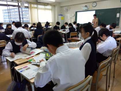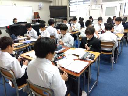2年音楽:「ラヴァーズ コンチェルト」を班ごとにアルトリコーダーで演奏しています。2つのパートに分かれて演奏するのできれいなハーモニーになっていました。