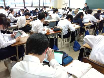 3年家庭:持続可能な食生活について学習しています。タブレットを使って昭和40年と令和4年の食糧自給率のデータを比較し、考察しました。