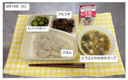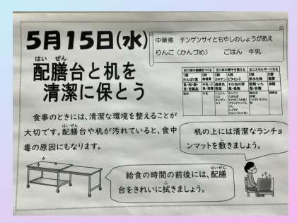 配膳台と机を清潔に保ち、手際よく給食を用意しましょう。そして、残食ゼロをめざして、しっかりといただきましょう。