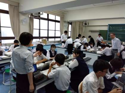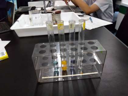 デンプンが『だ液』によってどのように変化するかを「ヨウ素溶液とベネジクト液」を使って調べました。どの班も変化がはっきりと見られ、良い結果が得られました。