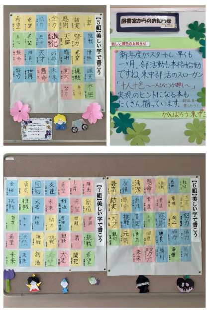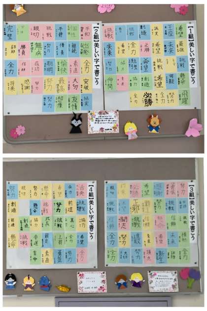 1年生の廊下に掲出されている生徒の作品です。一人ひとりが、集中して、今書けるそれぞれのベストの『美しい字』です。一人ひとりの作品が個性的ですし、学級のまとまりで見ると、7つのクラスの個性が見えるようです。そして、全クラスを集めると、1年生としての力強さも感じます。