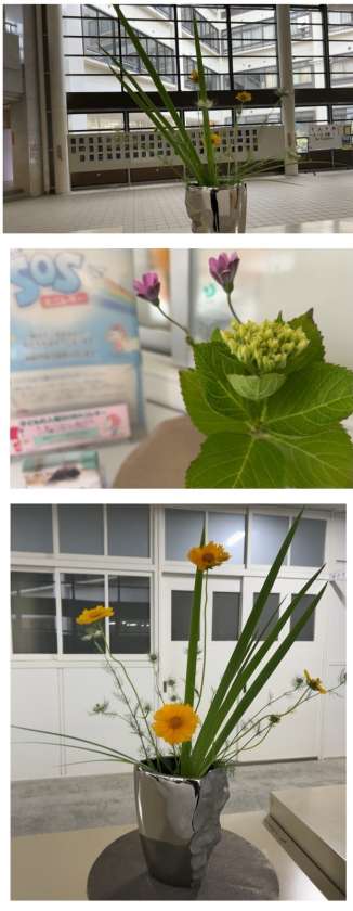 出勤すると、玄関ホールに「オクラレルカ・金鶏草(黄色の花)・ニゲラ(青色の花)」、職員室前には「あじさい」が迎えてくれました。いつも東中生のためにありがとうございます。また、新校舎への渡り廊下わきで、白い花を咲かせてきた「吹雪花(フブキバナ)」の小さな花弁が風に舞います。5月も半ばを過ぎ、生花からは季節の移ろいを感じます。