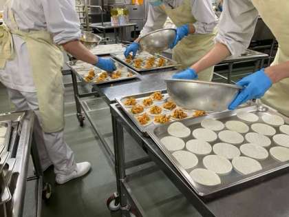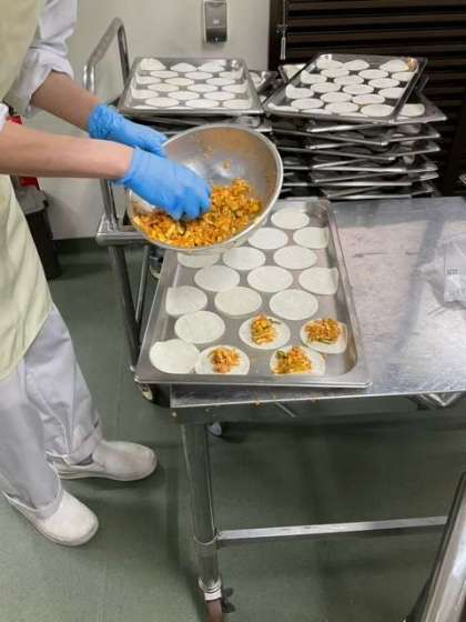 ぎょうざの皮で作った『変わりピザ』の調理中の写真です。