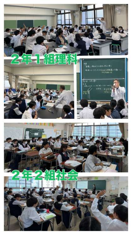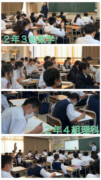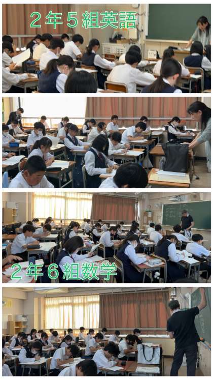 1組理科室で実験、2組教育実習生による社会、3組数学、4組理科、5組英語、6組数学。どのクラスも、しっかりと集中して授業に参加している生徒の姿が印象的です。