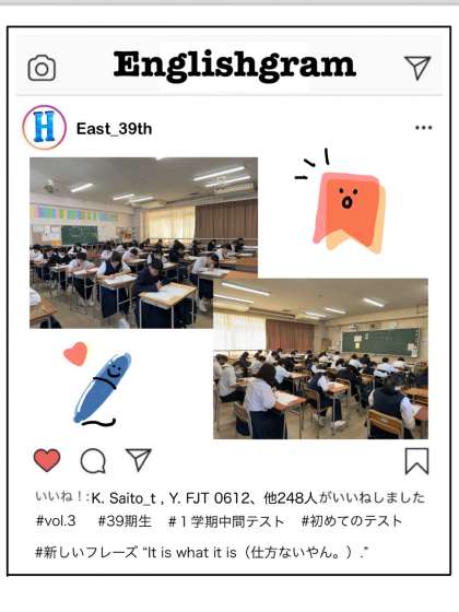 1年生英語科の先生が発行した『Englishgram』第3号を掲載します。『英語の学習に興味を持って取り組んでほしい』との願いが込められています。