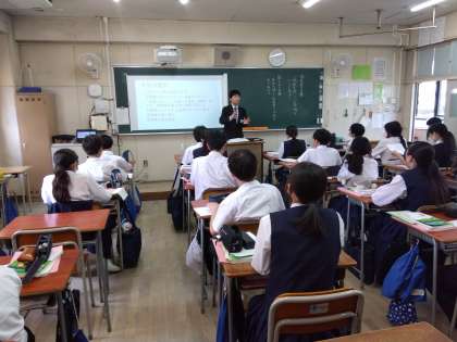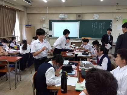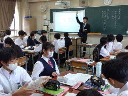 2年生国語:教育実習の先生の授業です。「人間は他の星に住むことができるのか」の単元で、自分の意見をまとめて班で発表しました。発表を聞いた班のメンバーは、発表の内容についてコメントをしました。話す生徒も、聞く生徒も積極的に活動できていました。