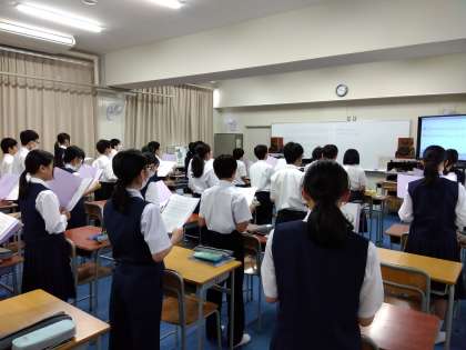 1年音楽:校歌を歌いました。歌う姿勢も確認して大きな声で歌いました。