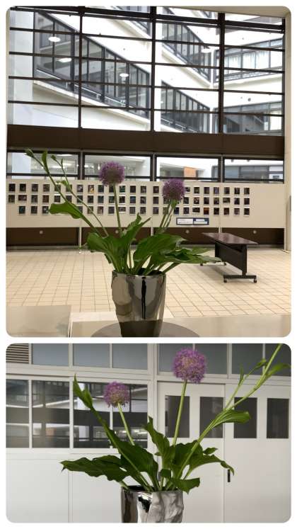 5月27日(月)は、小雨の降る朝となりました。お花を、玄関ホールに『アリウム・ギボウシ』、職員室前には『向日葵(ひまわり)・ギボウシ』に生け替えていただきました。いつも東中生のために、ありがとうございます。